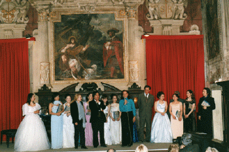 素晴らしい会場で歌うアミーチメンバー。司会はアミーチ・デッラ・リリカイタリア支部の講師、ルアーナ先生(ボローニャ歌劇団アルト歌手)
